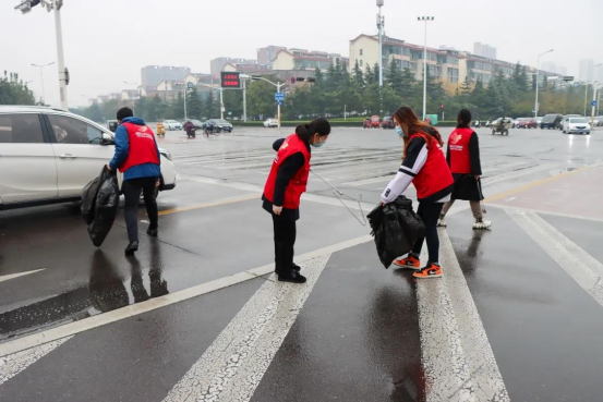 下雨不缺岗,热情不懈怠,党员志愿服务队首先来到广州路,协助道路环卫工人对雨后路边积水进行排水清理,对道路两侧人行道、绿化带内的烟头、纸屑、塑料袋、落叶等各类垃圾进行清扫、捡拾。在雨后寒冷的街头,身着红马甲的队员们成为一道亮丽的风景线。党员志愿服务队下午来到丝绸厂家属院,清理家属院的楼道、墙面、公共设施上胡乱张贴的小广告,清扫小区内的烟头、落叶等各类垃圾,劝阻遛狗不牵绳等不文明饲养宠物行为,帮助市民朋友养成良好的生活习惯。