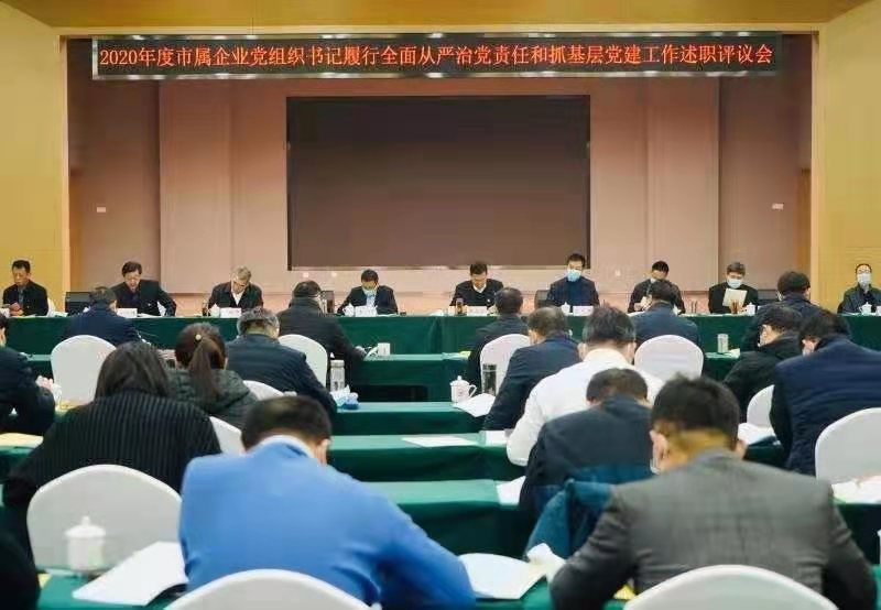 1月22日下午,2020年度市属企业党组织书记履行全面从严治党责任和抓基层党建工作述职评议会议召开。市监委委员陈肖东、市委组织部组织二科科长吉祥到会指导,市国资委党委书记、主任王富余主持会议并讲话。